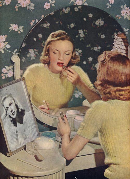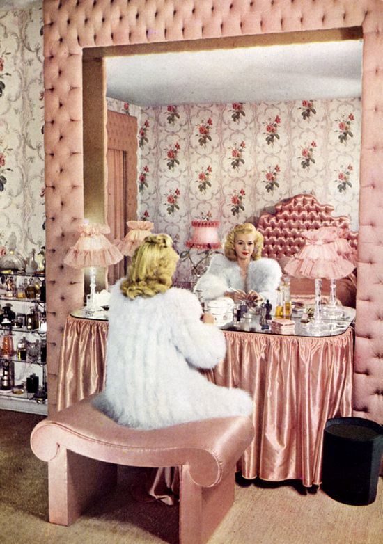 This morning I was getting ready at my vintage dresser when the thought came to me of the importance of having a vanity room or vintage styled place when getting ready to take on the day for all glamorous pinups. For me, my dresser sets the tone of the day, vintage glamour beginning to end, and there’s no other way. With this in mind I thought I’d share a few inspiring images of vintage ladies and their vanity spaces!