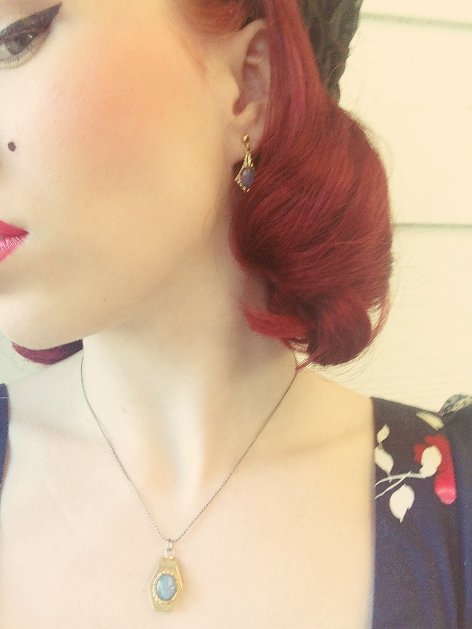 I’m wearing a vintage opal earring and necklace set which I inherited from my great grandmother, along with a brooch of hers which contains real flowers.