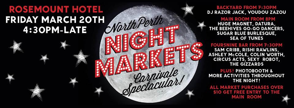 Brace yourselves Perth: Carnivàle entertainment, burlesque goddesses, stand-up comics & musos are about to invade Rosemount Hotel (459 Fitzgerald Street, Perth) come March 20th! The North Perth Night Markets: Carnivàle Spectacular will extend throughout the ENTIRE venue with markets open from 4:30 and a smorgasbord of carnivàle entertainment from 7:30!