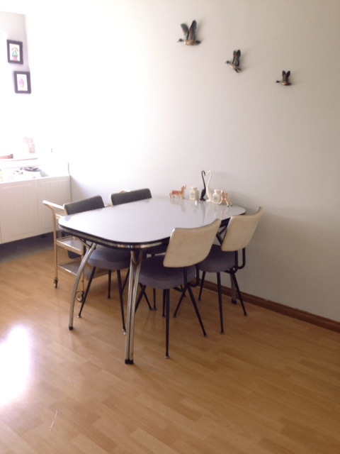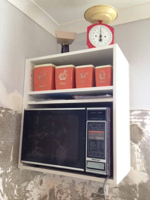 We’re freeing up some bench space by using a hanging cupboard to store our microwave as well as another cute vintage canister set. One of the main reasons of our renovation was to create more bench space and a more practical set up.