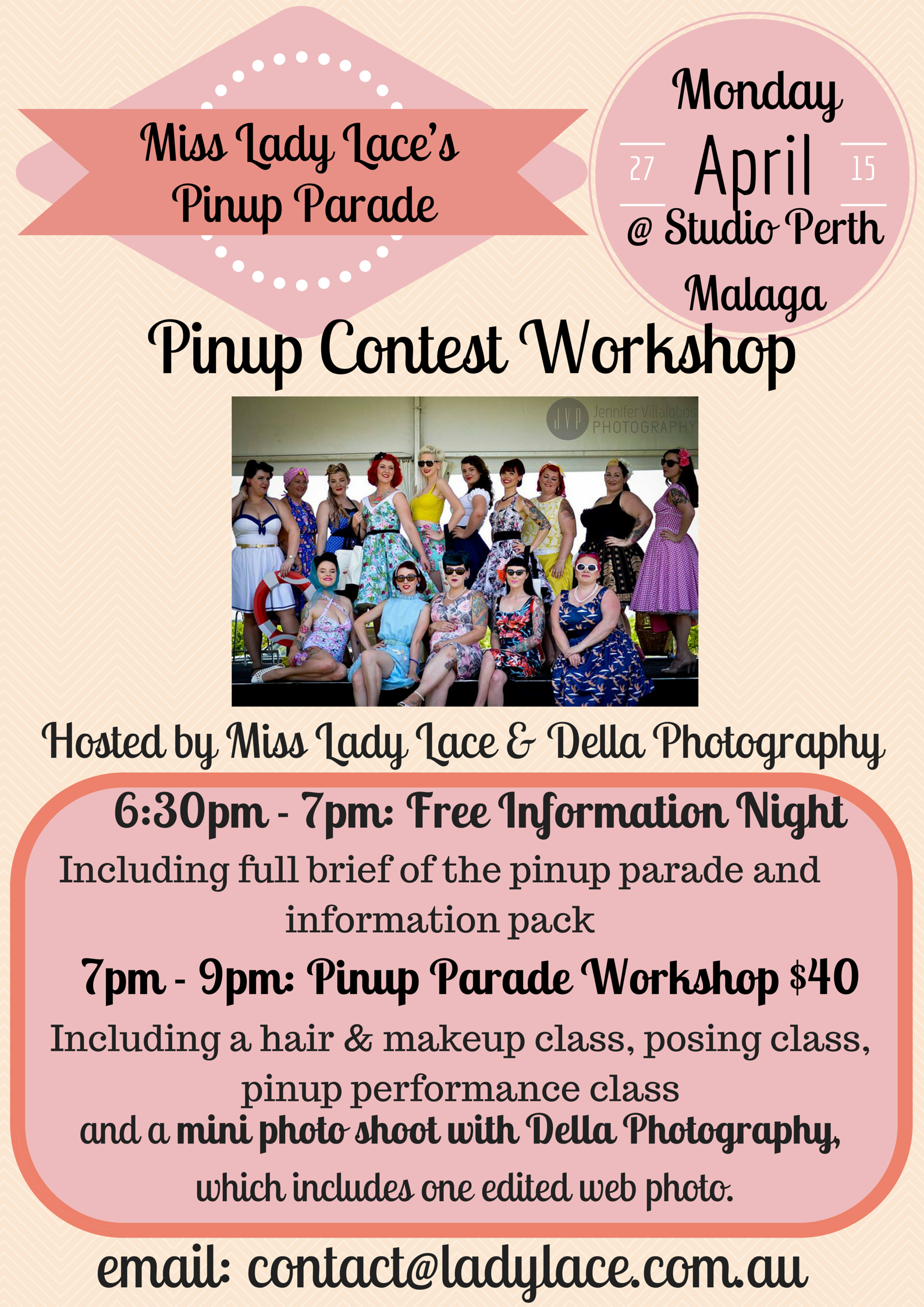Entries are now open for the Pinup Parade, and close on May 15th. One of the biggest concerns I receive from lovely ladies looking to enter is they’re not sure what to expect, or what to do in the parade so for our next parade we’ve put together a Pinup Contest Workshop taking place THIS MONDAY the 27th at Studio Perth. The first part of the evening is a free information night where the Parade will be discussed, what to expect, Q&A and everyone will receive an information pack. The second part of the evening is The Full Pinup Workshop which costs $40 and includes a hair and makeup class, posing class, performance class, and a mini photo shoot with Della Photography where you’ll receive one web-sized edited photo which is perfect for your entry photo for the Parade.