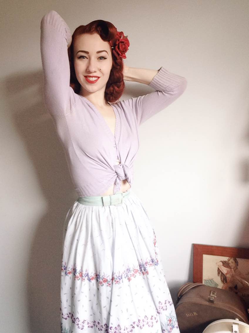 While we did not have a theme, I dressed as I normally would, I wore a lilac cardigan, with a vintage blue floral skirt and waist belt, and accessorised with my Daisy Jean Floral rose hair piece, and vintage earrings.