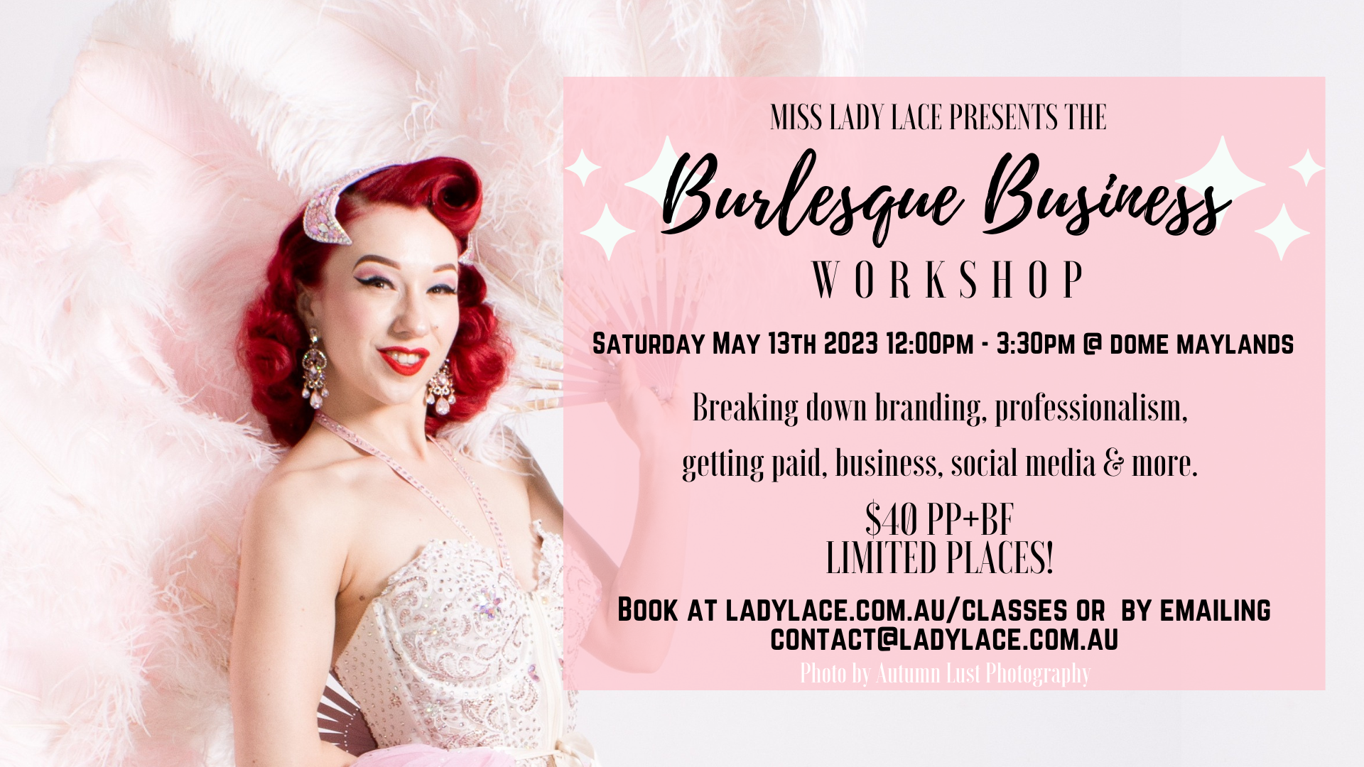 Do you have a passion for burlesque and/or pinup? Would you like to elevate your art to the next level? Perth’s very own vintage queen, Miss Lady Lace, is hosting a workshop exploring the success and professionalism in these glamorous industries, breaking down branding, social media, aspects to a business, how to get bookings and so much more.