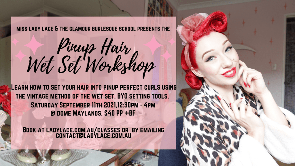The Pinup Hair Wet Set Workshop is an exclusive workshop hosted by Miss Lady Lace teaching the art of curling your hair into pinup perfection using the classic art of the wet set. The workshop will teach a range of methods of curling but focuses on the how to get the perfect wet set teaching all the fundamentals, how to make your own setting lotions, setting patterns and so much more. The afternoon with begin with an introduction, look at different styles through the decades, teach different curling methods, then the wet set demonstration. Each student will use their foam curlers or other tools they’ve brought to set their hair with assistance from Miss Lady Lace. Brushing out methods and styling will be also demonstrated for you to try at home.